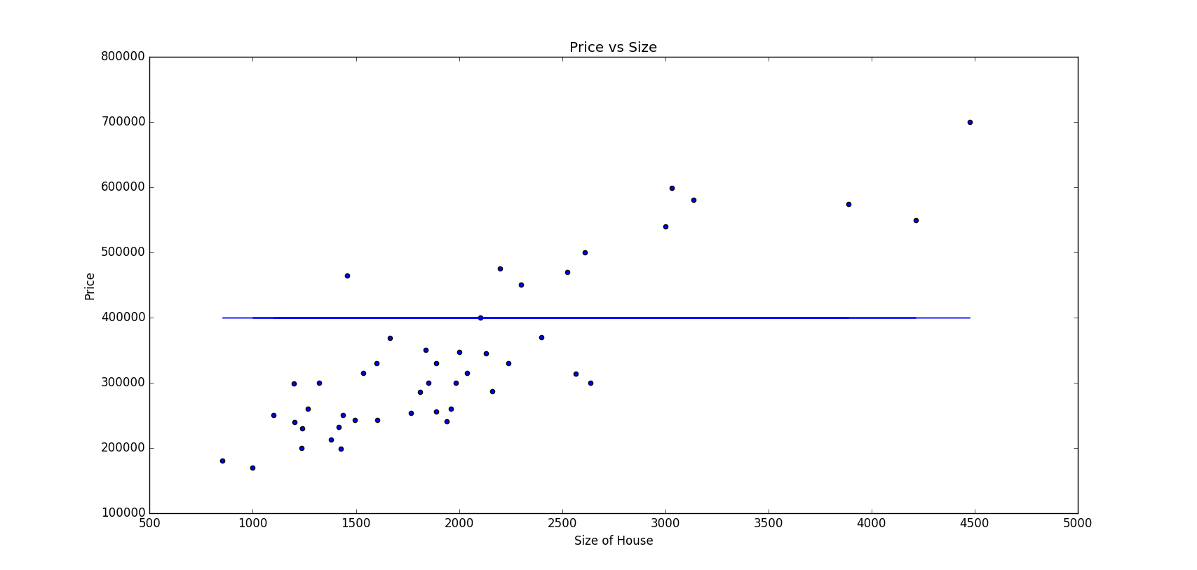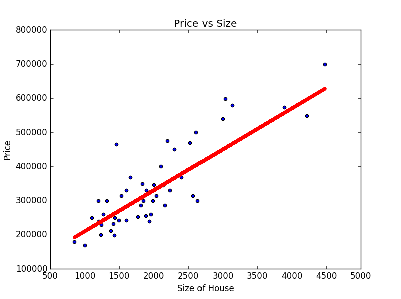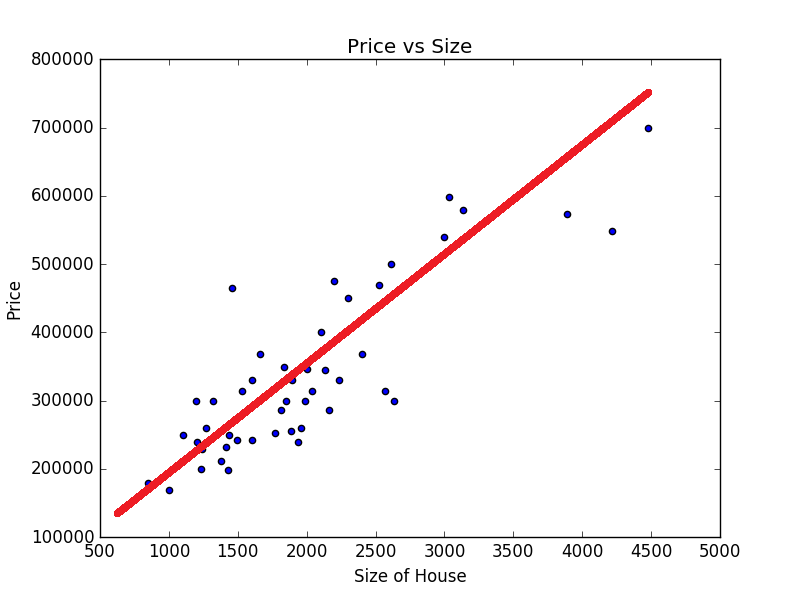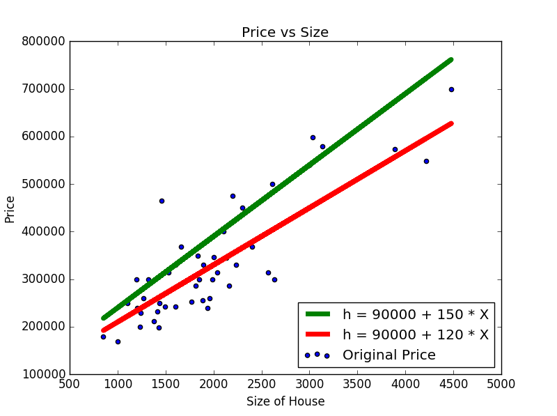 এইবার প্রতি বাড়ির সাইজের জন্য আমাদের হাইপোথিসিস এর আউটপুট এর স্ট্রেইট লাইন প্লট ও স্ক্যাটার প্লটের আউটপুট কম্পেয়ার করে দেখা যাক