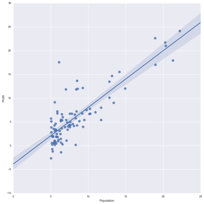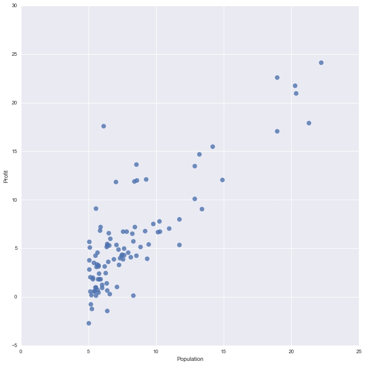 sns.lmplot(x="Population", y="Profit", data=df, fit_reg=False, scatter_kws={'s':45})