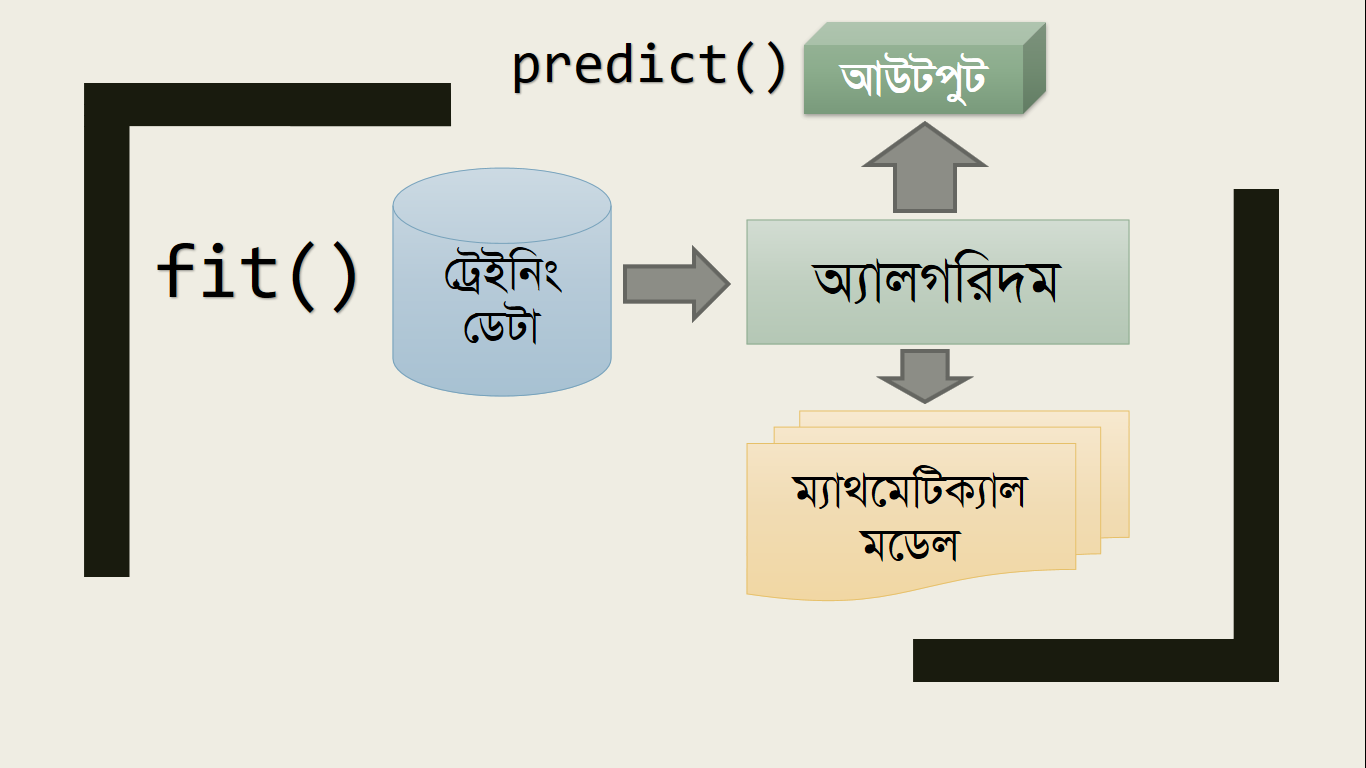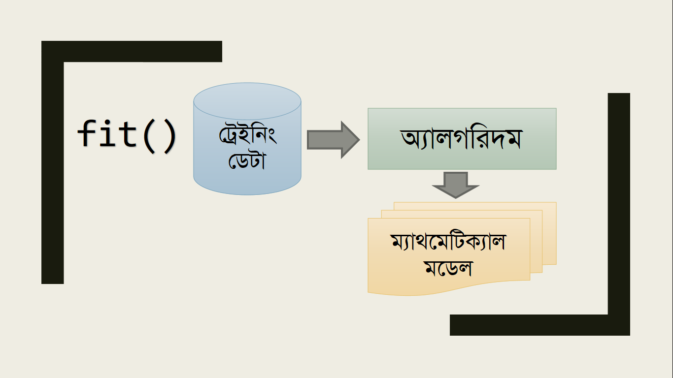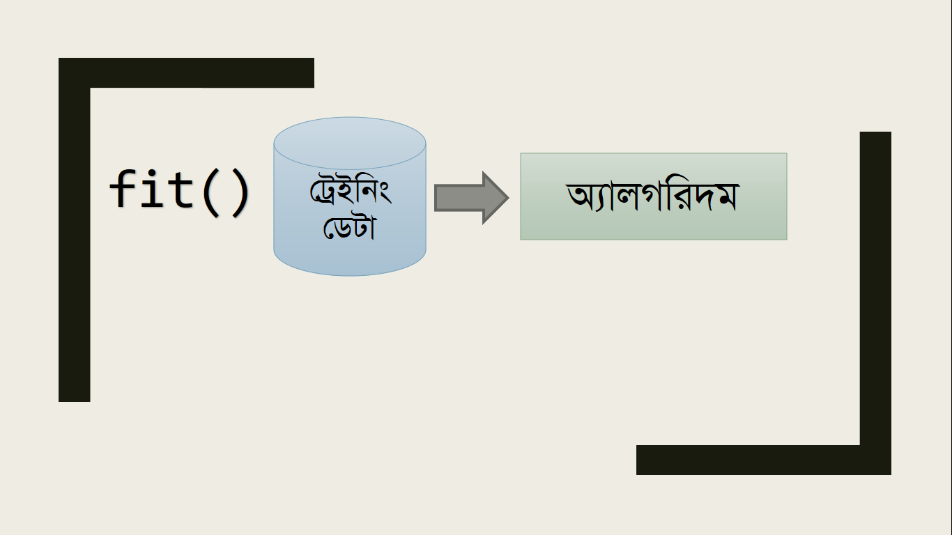 এবার এই ট্রেইনিং ডেটা আমরা অ্যালগরিদমে Feed করি, সাধারণত Scikit-learn এ অ্যালগরিদমে ফিড ও অ্যানালাইসিসের কাজ করার জন্য fit() ফাংশন ব্যবহার করলেই হয়।